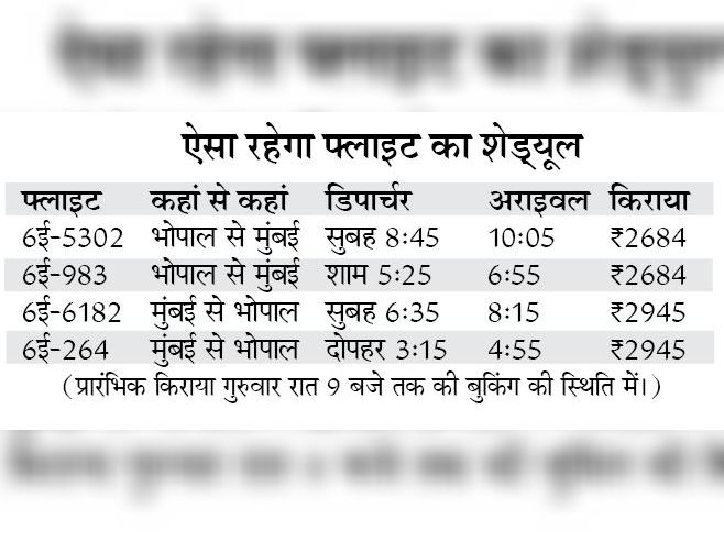 इंडिगो एक जुलाई से भोपाल से मुंबई के लिए बीच एक साथ दो फ्लाइट शुरू करने जा रही है। ऐसे में जुलाई से भोपाल-मुंबई के बीच फ्लाइट्स की संख्या बढ़कर तीन हो जाएगी। फिलहाल मुंबई के लिए एअर इंडिया एक फ्लाइट संचालित हो रही है।